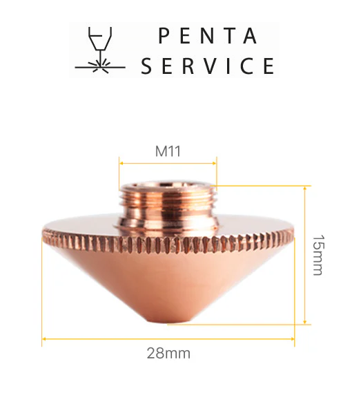 Сопло PENTA SERVICE диаметром 28 мм, высотой 15 мм. Имеет диаметр отверстия 6,0 мм, произведено из меди с соблюдением всех необходимых стандартов качества, технических и геометрических параметров изделий данного типа. В результате применения, сопло гарантирует сохранение расчётных параметров в течение длительного времени и обеспечивает высокую мощность работы оборудования лазерной резки.